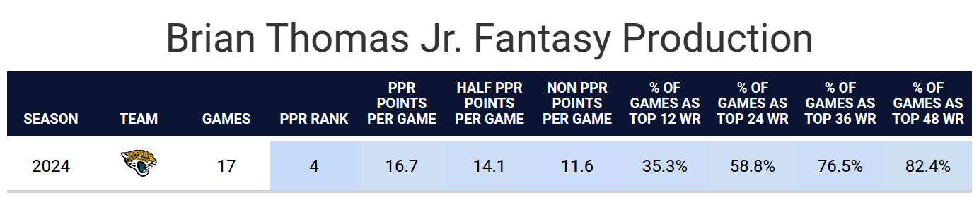 - Brian Thomas Jr. found his rhythm: Over the last seven weeks of the 2024 season, Thomas consistently scored fantasy points and had the third-most points among wide receivers during that stretch.
