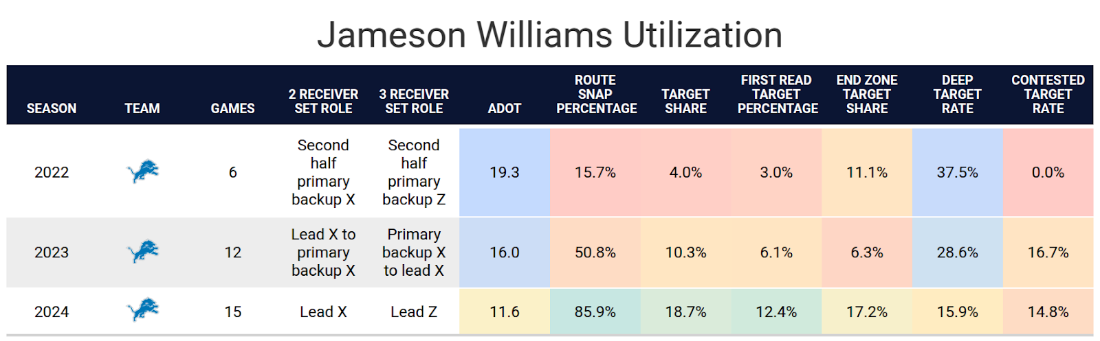 Jameson Williams was a highly talented college player, but an ACL injury and suspension led to a quiet first two seasons in the NFL. Detroit started using Williams more on short and intermediate passes in 2024, allowing him to take advantage of his speed after the catch. By mid-season, he consistently gained at least 8 PPR points per game, making him a reliable fantasy starter. He accomplished this despite Detroit having several other offensive weapons. The Lions have a new offensive coordinator who has always given a lot of praise to Williams, which could further increase his fantasy value this season.