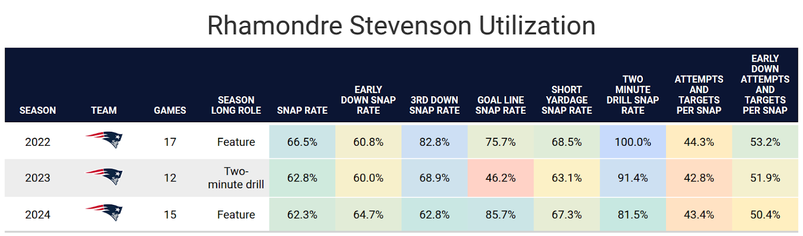 Rhamondre Stevenson has spent the last four seasons with the Patriots and has been an every-down lead back with a capable veteran backup most of the time. His quality of play is very dependent on the offensive line, and the line had the worst team run-blocking grade last season. He reunites with offensive coordinator Josh McDaniels, who was his offensive coordinator in his first season. In 17 of McDaniels' 18 seasons, the running back who leads his team in rushing attempts is not the same one who leads his backfield in third-down snaps. The Patriots spent the 38th overall pick on TreVeyon Henderson, who was arguably the best receiving back in this draft class. That means Stevenson will likely lose most of his passing-down work. He should still receive double-digit carries most weeks, and the Patriots made multiple changes to the offensive line, which should help his production.