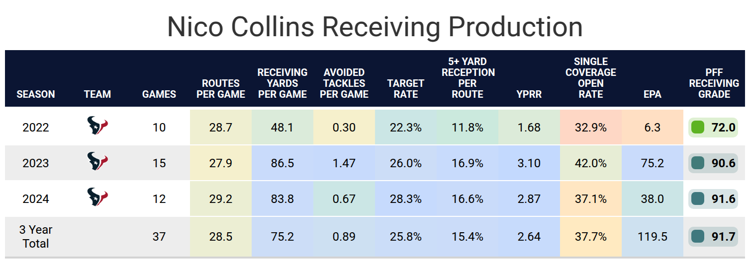 - Nico Collins is among the league’s top wide receivers: Collins has posted a 93.2 receiving grade over the last two seasons combined, which ranks first among all wide receivers.
