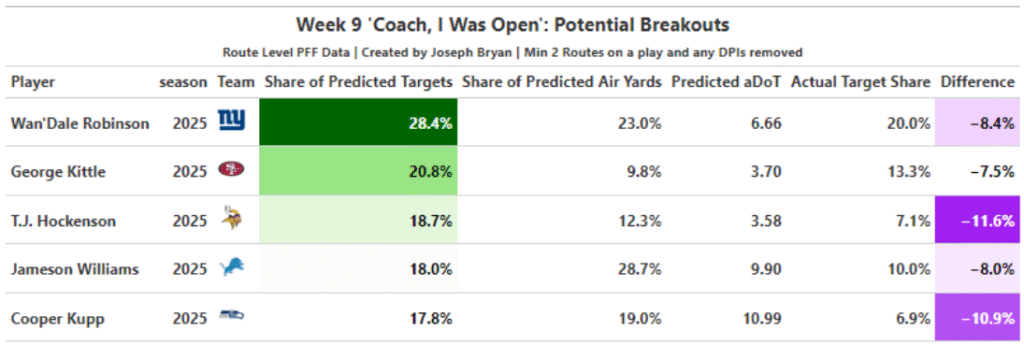 These are players who were open far more often than they were targeted in Week 8. Historically, players who appear on this list tend to see an increase in both target rate and target share in the weeks that follow, relative to their own prior usage and to other players with comparable roles.
