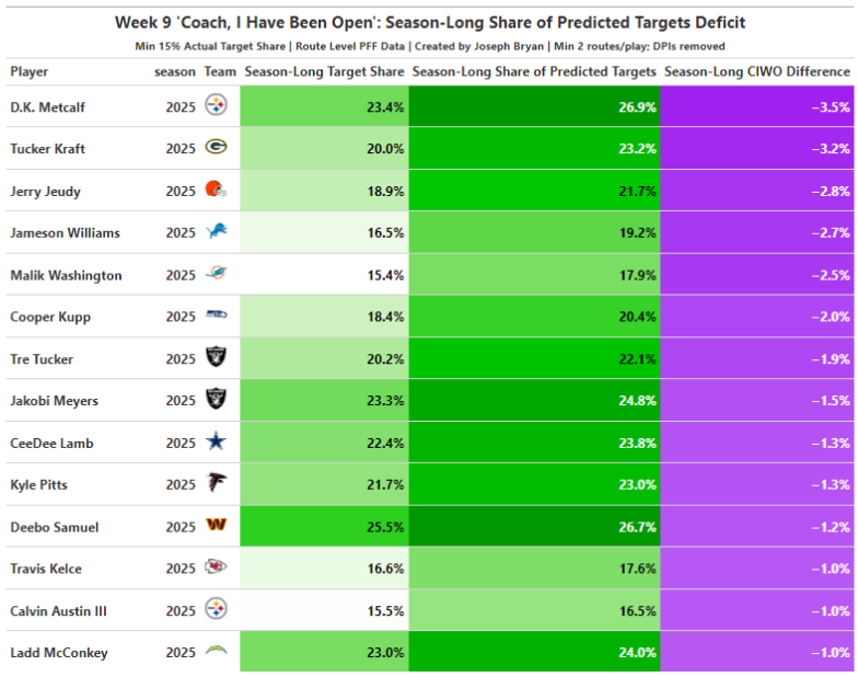 D.K. Metcalf, who was a potential breakout candidate last week, appears as the player with the largest deficit. This indicates that Metcalf has consistently created separation this season but hasn’t been targeted as frequently as his level of openness would suggest.