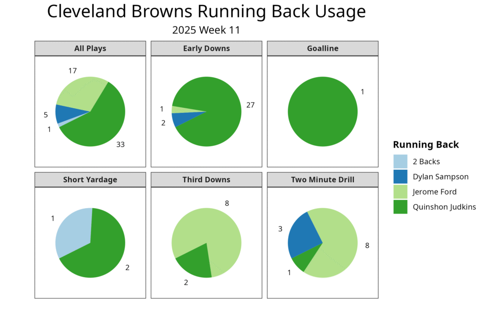 Judkins is playing a consistent role in the Browns' offense. He has logged 77.2% of offensive snaps on early downs since Week 3, ignoring Week 8 when he was injured. He’s also played 96% of short-yardage snaps and 75% of goal-line snaps, but he isn't on the field often on third downs or in two-minute drills. His volume is tied to the game script. The rookie has averaged 21 carries per game when the Browns win or lose by a touchdown or less, and he has averaged 13 carries per game when the Browns lose by multiple scores. He is averaging just 1.5 receptions per game, limiting his value in PPR leagues.
