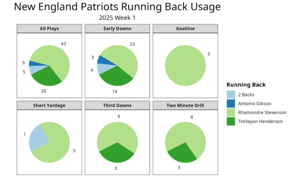 The preseason suggested Rhamondre Stevenson and Henderson were destined for a 50-50 snaps split, with the goal of Henderson eventually taking the majority of work. Instead, Henderson played 35% of snaps in Week 1, including sub-41% snap rates in every situation. On the bright side, the Patriots often gave Henderson the ball when he was on the field. He ran five times for 27 yards and caught six passes for 24 yards.