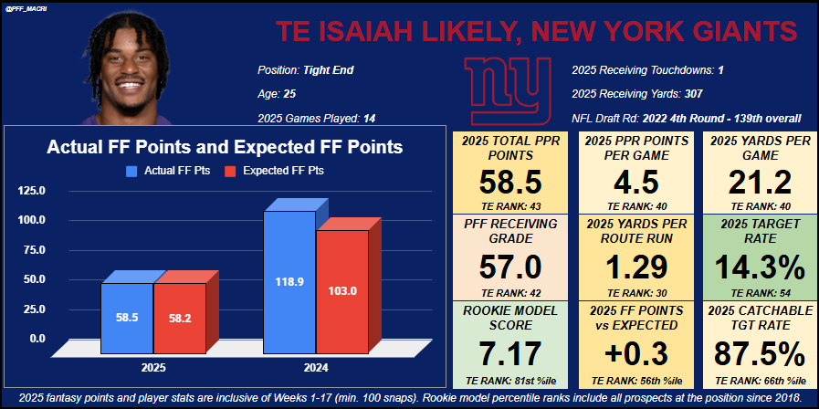 Without Andrews to limit his ceiling, Likely will have a shot to deliver on some of his promising underlying metrics, including a 1.45 career yards per route run mark, which ranks 17th among 40 qualifying tight ends since 2022. Fantasy managers should expect to see a significant improvement from his past fantasy seasons and make him more worthy of fantasy draft capital. Even though emerging as a top-six fantasy tight end is going to take a massive improvement, his range of outcomes as the Giants’ weekly TE1 should be good enough to create fringe TE1-TE2 fantasy production on a weekly basis, likely finishing as a low-end TE1 or high-end TE2 in a fully healthy season.