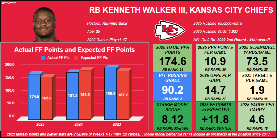 Kansas City’s offense should have no problem leaning on Walker in the run game while allowing him to add value on passing downs as a potential three-down player. Assuming that Patrick Mahomes is back healthy in 2026 as well, the Chiefs should get back on track as one of the more high-scoring offenses, creating a lot of high-value goal-line touches for Walker to capitalize on as well. If healthy, fantasy managers could finally get that weekly RB1 season from Walker that we’ve been expecting for several years now.