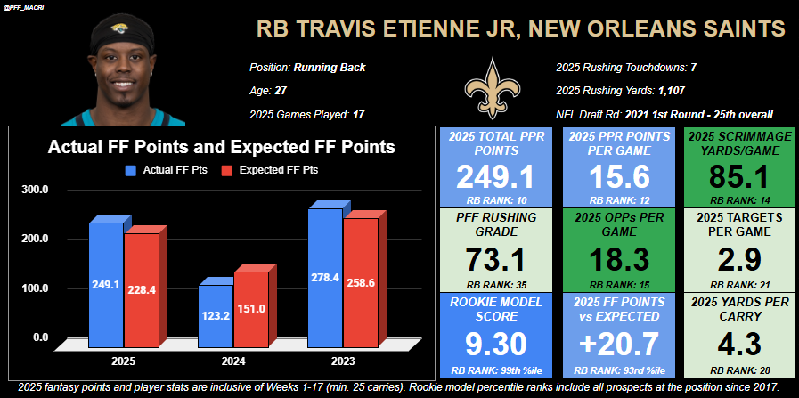Etienne has over 900 carries and nearly 200 receptions in his four-year NFL career, which has been a massive part of his fantasy value through the years. With those high-end opportunities, Etienne owns an 86.1 PFF rushing grade, 25th among 38 running backs with at least 500 carries since 2022. While not stellar numbers, he has been effective and should be again in Kellen Moore’s offense. As a receiver, Etienne’s 67.7 career PFF receiving grade ranks 23rd among 51 running backs with at least 500 routes run since 2022. Considering he should be in for another big role, assuming Kamara is indeed done in New Orleans, there’s no reason not to expect strong results from Etienne again in 2026, operating as a potential low-end RB1, high-end RB2.