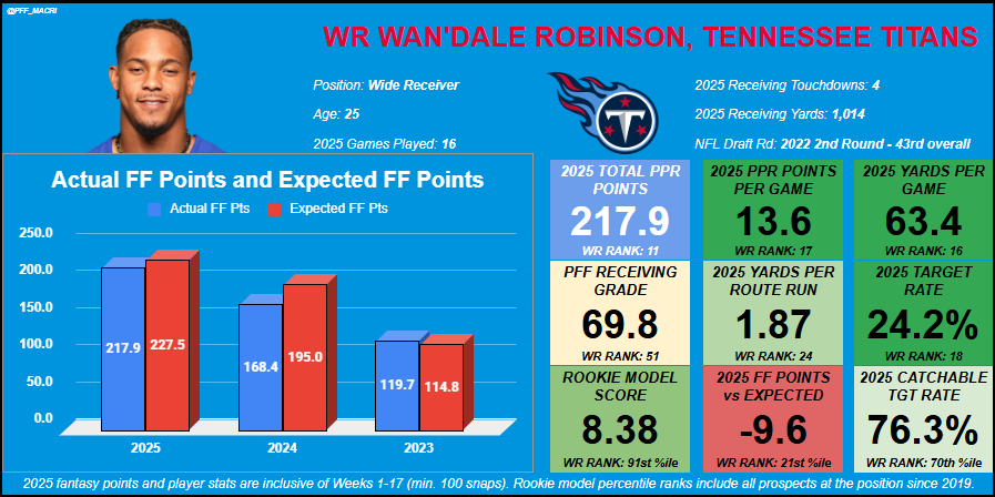 Robinson fell into WR1 production in a perfect 2025 situation, though all of his efficiency numbers tell a better story for what to expect, finishing just outside the top-50 in PFF receiving grade, 21st percentile in fantasy points versus expected and much closer to a WR2 in his per-game stats. That was in an ideal situation where he was the clear WR1, though, while the Titans’ receiving corps is still thin, it will more than likely continue to add in that regard with plenty more cap space and a need to do so.