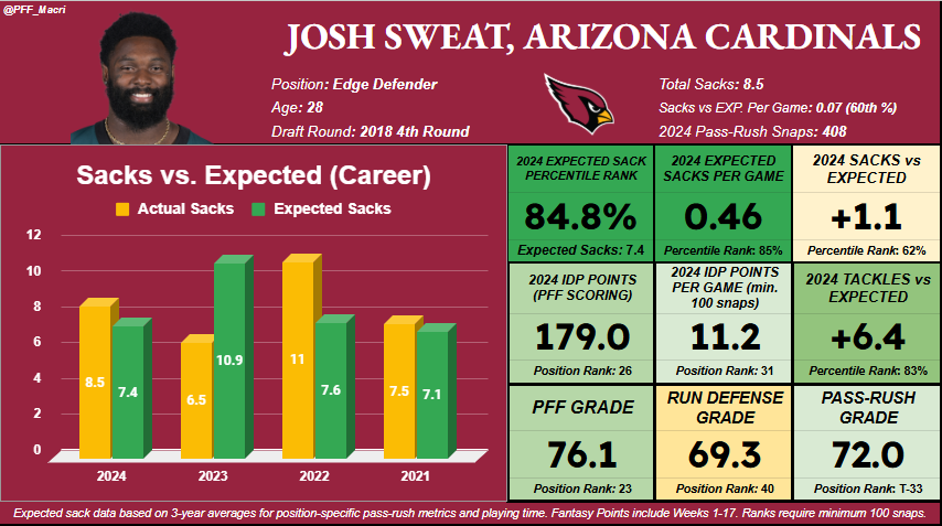 Sweat finds a new home in Arizona, where he reunites with former defensive coordinator Jonathan Gannon, with whom Sweat had his best season, delivering a career-high overall grade (86.6), pass-rush grade (82.1) and sack total (11). Sweat also immediately becomes the top edge defender on the Cardinals roster, which puts him in play to be on the field for another high-end workload in 2025. Over the past four seasons, Sweat has averaged 41 defensive snaps per game, which should be considered his floor with the Cardinals in 2025.