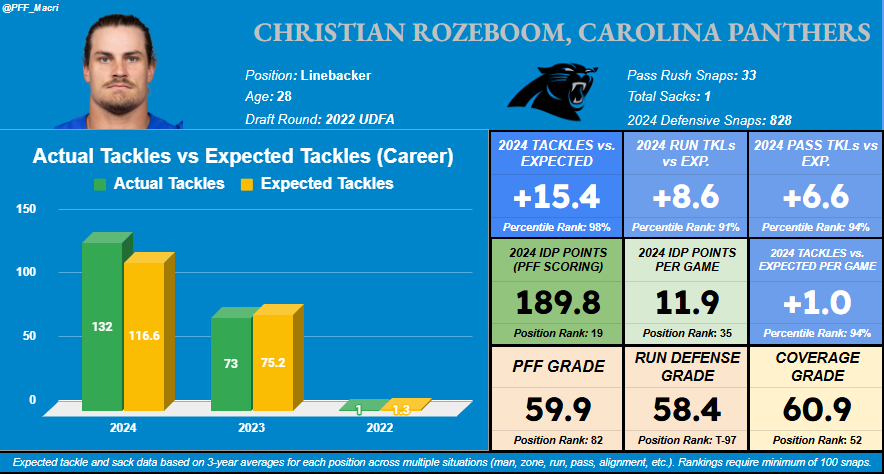 Josey Jewell getting cut a few weeks ago opened up a big opportunity for Rozeboom in 2025, as he goes from being a potential part-time player on this defense to now wearing the green dot for Carolina. That value boost is a significant one, as we can now get behind him for all league formats as a very cheap every-down player. Last season with the Rams, Rozeboom found ways to produce on just a 74% defensive snap share.