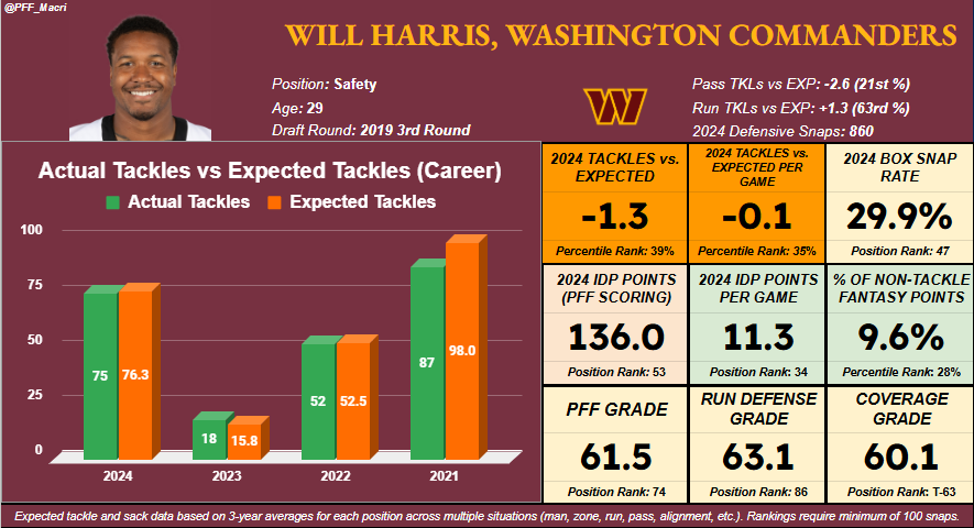 Harris is in a good position to take over the box-heavy role in Dan Quinn’s defense – a role that allowed Jeremy Chinn to deliver a bounce-back IDP season last year, playing 41% of his defensive snaps in the box and finishing as a top-20 IDP safety. Harris’ size and experience playing closer to the line of scrimmage in the past make him the best bet among the Commanders’ current crop of safety options to absorb that role and become the top IDP target.