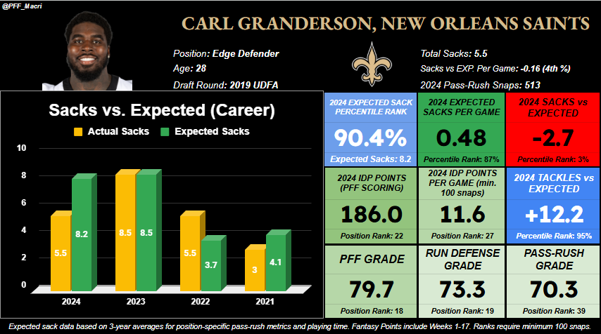Granderson’s potential becomes even greater for IDP in 2025 on the back of his playing time and high-end tackling ability, as he also ranked 95th percentile in tackles versus expected after leading the position in that regard in 2023. The combination of Granderson’s playing time, tackling ability and positive expected regression in the sack column makes him an obvious unique bet to make in IDP drafts this offseason to target while other drafters miss out.