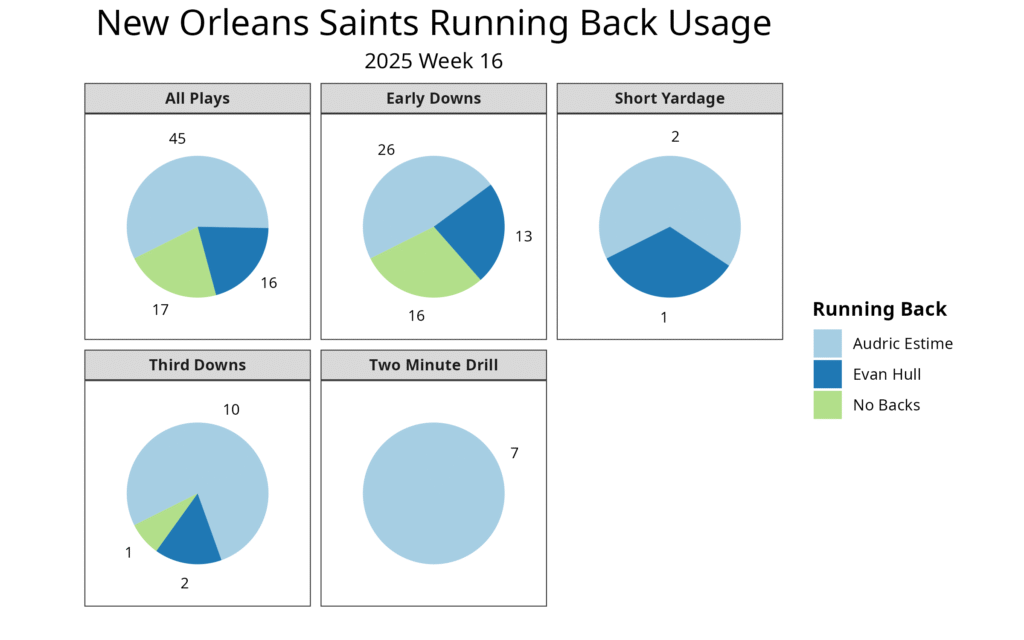 This week, the team primarily turned to Estime in terms of playing time. He remained the passing-down back like last week but also doubled Hull’s playing time in early-down and short-yardage situations. However, the team primarily turned to Taysom Hill as their primary runner. Hill took 16 snaps lined up at running back, which was tied for his most snaps in his career. He ran the ball nine times while lined up at running back, which was his most runs from a running back position in his career.