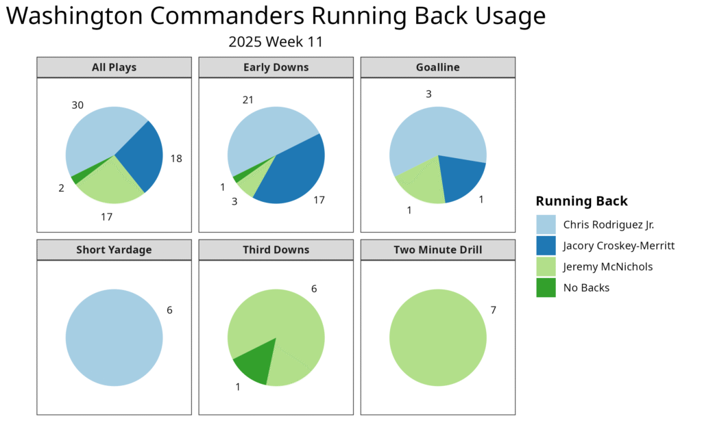 The Commanders started the season with Austin Ekeler as their starting running back, using him for two drives before turning primarily to Jacory Croskey-Merritt. After Ekeler’s season-ending injury, Rodriguez took over as the starter for two weeks. Croskey-Merritt played well enough over the first four weeks to earn the starting job in Week 5, leading to a 14-carry, 111-yard and two-touchdown game. However, he was held to 3.6 yards per carry or fewer in each of the past five games.