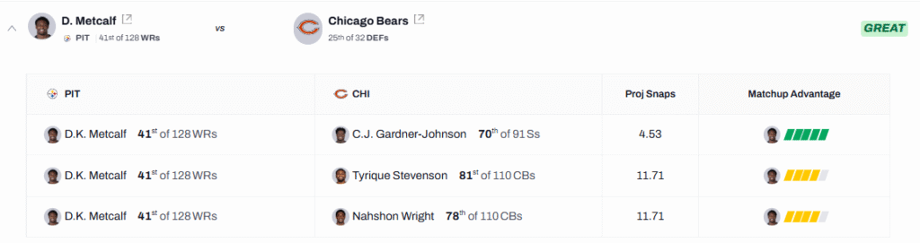 Chicago allows the ninth-highest percentage of open targets to wide receivers and the second-most yards per reception to the position. The Bears have the worst PFF team grade when defending wide receivers this season, making this one of the best on-paper matchups Metcalf has seen.