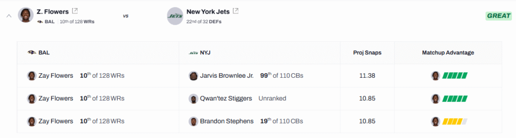 Per PFF Premium Stats, the New York Jets rank as the 10th-worst team in PFF coverage grade and the eighth-worst in PFF pass-rush grade. On paper, this gives Zay Flowers a favorable matchup against a defense that has not consistently disrupted opposing passing games.