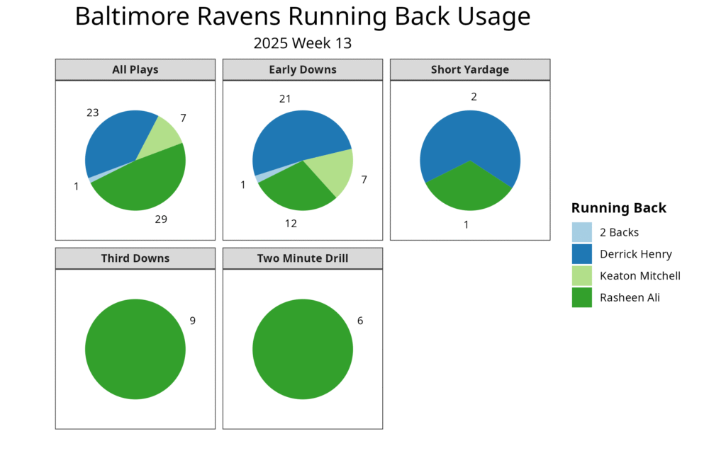 Hill missed Week 11 with a toe injury, which pushed Mitchell into the backup early-down role and put Rasheen Ali on third downs and in two-minute situations. Hill returned last week and Ali was inactive. This week, Ali and Mitchell split the backup work, due in part to Baltimore playing from behind, with Ali continuing to handle late-down snaps.