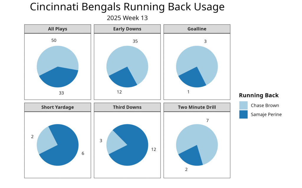 Perine mostly settled back into his usual role. He remained the clear third-down option and primary backup, and while his snap share wasn’t quite back to pre-injury levels, the Bengals used him more heavily as a runner, similar to right before the injury. Brown notably handled most of the two-minute drill work — a spot that typically belongs to Perine, though not always consistently.
