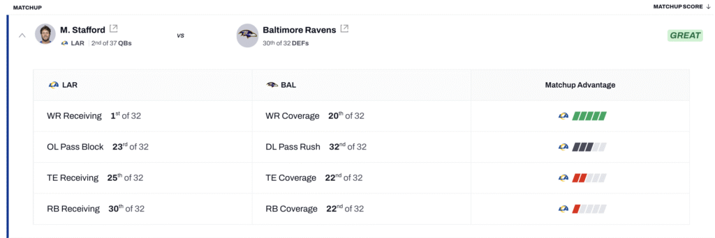 Stafford profiles as one of the top streaming and DFS options heading into Week 6. He’ll face a Ravens defense that was just torched for 44 points by the Texans and remains banged up in the secondary. Baltimore is allowing 24.6 fantasy points per game to quarterbacks, and Puka Nacua has a favorable matchup edge this week, per the PFF Matchup Tool.