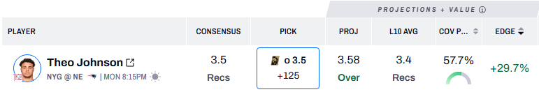 TE Theo Johnson, New York Giants: Over 3.5 receptions (+125)