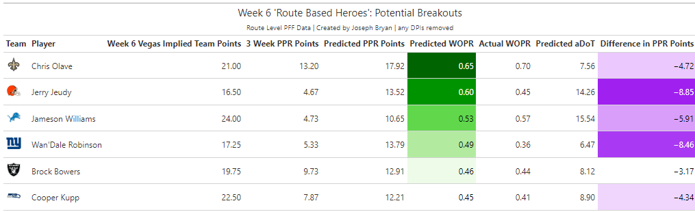 Chris Olave is producing outstanding PWOPR and actual WOPR, but is being let down by a poor offensive passing attack. When the Saints’ offense is clicking, big games are in store for Olave.