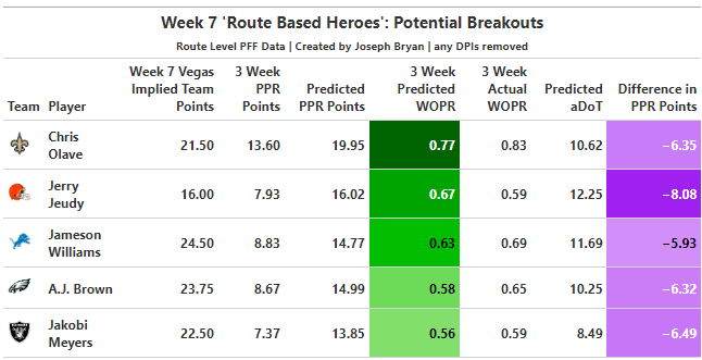 Positive regression models like the one created for this article often feature wide receivers on struggling passing offenses. This is a function of the team’s lesser ability to score, and sometimes the quarterback’s ability to accurately get the ball to the receiver. Jerry Jeudy recorded only five receptions on 13 targets (eight of which were considered catchable). He had the 13th-highest PWOPR for Week 6 and the second-highest number of predicted air yards (133).