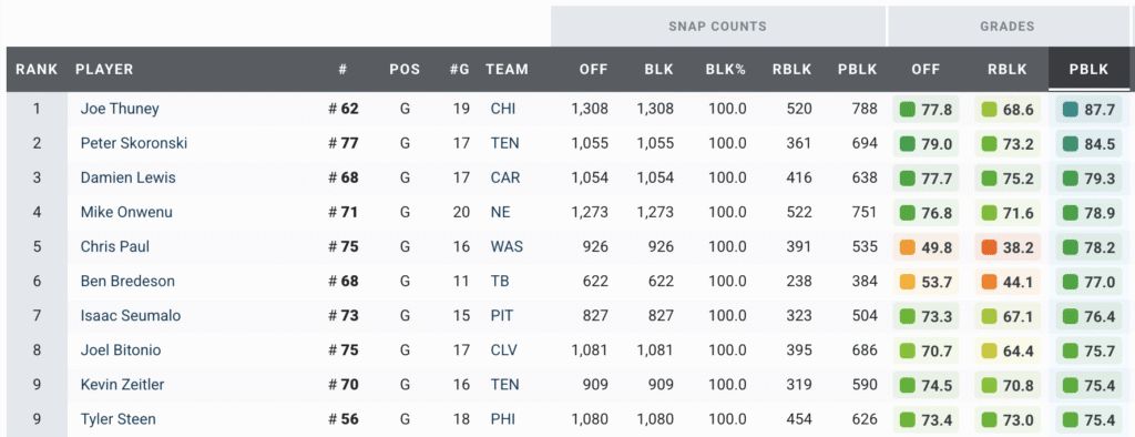 - The 10-year NFL veteran has been the best pass-blocking guard in the NFL for years: Since 2018, he has earned a 91.4 PFF pass-blocking grade, the highest among all guards over that span. He has allowed a pressure on only 3.3% of his 6,189 pass-blocking snaps, which is both the largest workload by a significant margin and the third-best pressure rate.