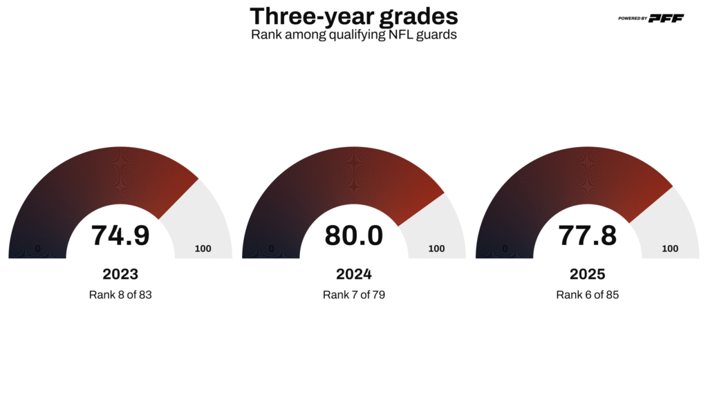 The 10-year NFL veteran has been arguably the best pass-blocking guard in the NFL for years — and there’s a strong case he’s been the best pass-blocking offensive lineman, regardless of position. Since 2018, he has earned a 91.4 PFF pass-blocking grade, the highest among all guards over that span. He has allowed a quarterback knockdown — defined as a sack or quarterback hit — on just 0.7% of his pass-blocking snaps, the third-lowest rate in the league, and has surrendered pressure on only 3.3% of his 6,189 pass-blocking snaps, which is both the largest workload by a significant margin and the third-best pressure rate.