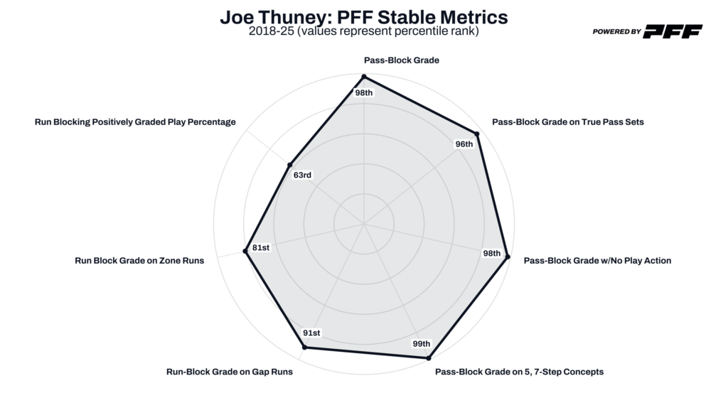 - The 2025 season was another outstanding one from Joe Thuney: His 88.6 PFF pass-blocking grade during the regular season ranked third among all offensive linemen and led all guards in the NFL. He also posted a quarterback knockdown rate of just 0.1%, which ranked third among all offensive linemen and first among guards.