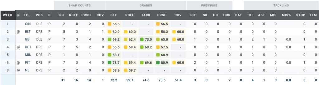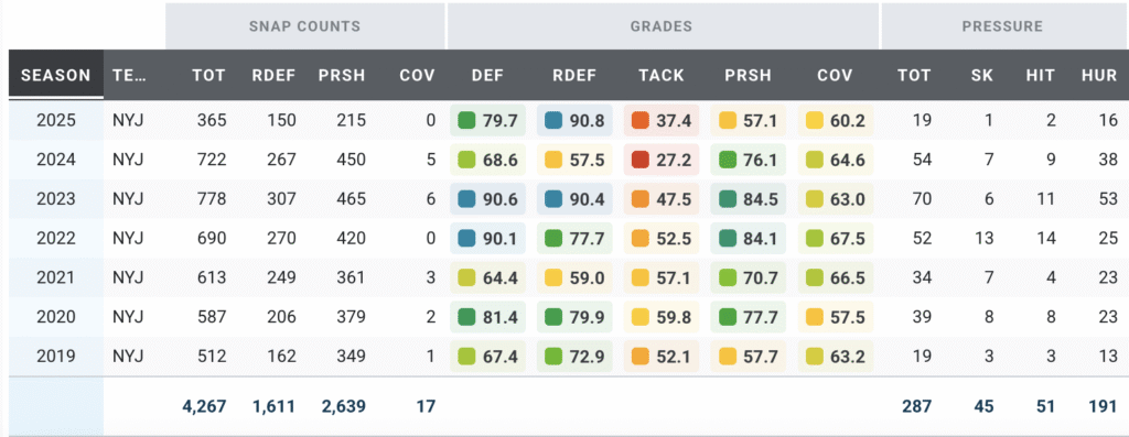 - The Ravens add defensive line depth: Jones might not dramatically raise the ceiling of the Ravens defense, but he undoubtedly raises its floor. He’s earned a PFF pass-rush grade above 65.0 in all seven of his NFL seasons and has already produced 19 pressures in 2025 — including five sacks and four quarterback hits — earning a 67.5 PFF pass-rush grade and an 11.5% win rate.