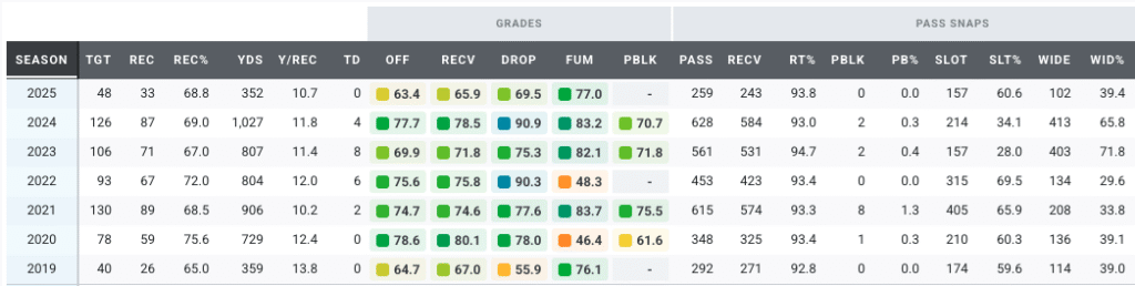 Meyers’ sure hands stand out — he’s dropped just two passes on 174 targets since the start of last season, the third-lowest drop rate in the league over that span. His veteran presence should immediately help Trevor Lawrence find rhythm in the passing game while giving the offense the steady, dependable option it’s been missing.