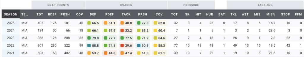 Jones might not dramatically raise the ceiling of the Ravens defense, but he undoubtedly raises its floor. He’s earned a PFF pass-rush grade above 65.0 in all seven of his NFL seasons and has already produced 19 pressures in 2025 — including five sacks and four quarterback hits — earning a 67.5 PFF pass-rush grade and an 11.5% win rate.