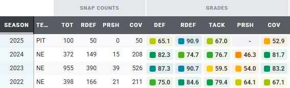 Although Peppers didn’t catch on in Pittsburgh, playing just 100 snaps, he isn’t far removed from a strong track record in New England from 2022 to 2024. Over that span, he proved to be a versatile chess piece deep, in the slot and in the box, producing a 75.0-plus PFF overall grade in each of those seasons.