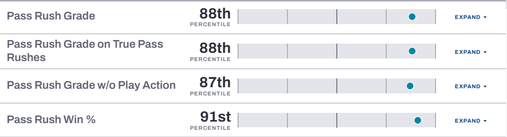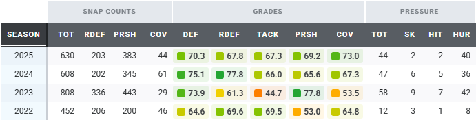 While Mafe isn’t the same caliber of pass rusher that Hedrickson is — not many are — his overall body of work is consistent. The former Seahawk has earned a 70.3 PFF overall grade in each of the past three seasons while ranking in the 80th percentile in PFF pass-rush grade on true pass sets (84.2). As was the case when Hendrickson left New Orleans for Cincinnati in 2021, the hope is that Mafe can take the next step with the Bengals.