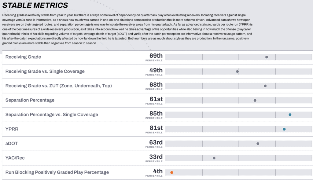 A lot of those numbers were inflated by a monster performance in Week 15 against the Tampa Bay Buccaneers, where he caught 11 passes for 166 yards and three touchdowns for a 92.3 PFF receiving grade that was the best since his rookie year.