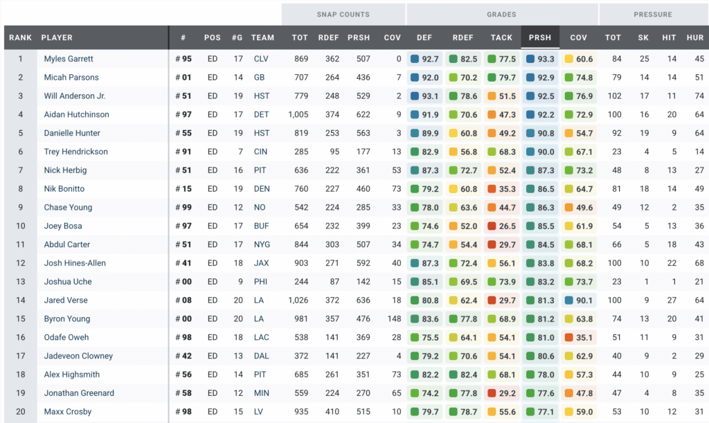 Trey Hendrickson stands out as PFF’s highest-ranked free agent regardless of position. He has graded among the top 20 edge defenders in each of the past three seasons. While Hendrickson will be 31 entering the 2026 season, the Chargers have already shown a willingness to rely on veteran pass rushers, as evidenced by Mack’s role in recent years.