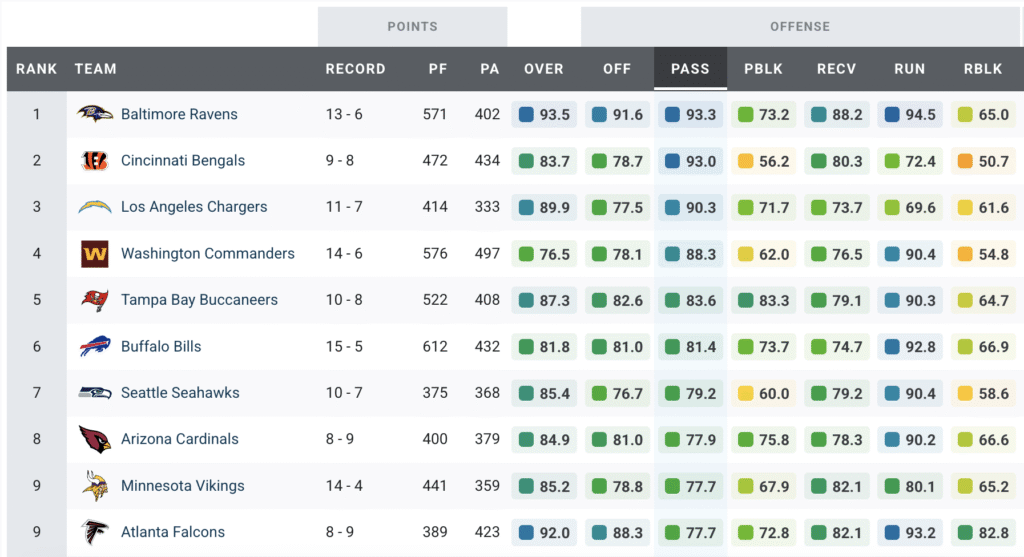 - Jesse Minter has made the leap: In 2024, working with a largely inherited roster, Minter’s defense impressed. The Chargers ranked fifth in EPA allowed per pass (-0.037) and posted the fifth-best team coverage grade (78.3). They also finished 12th in EPA allowed per rush (-0.124) and sixth in team run-defense grade (74.6).