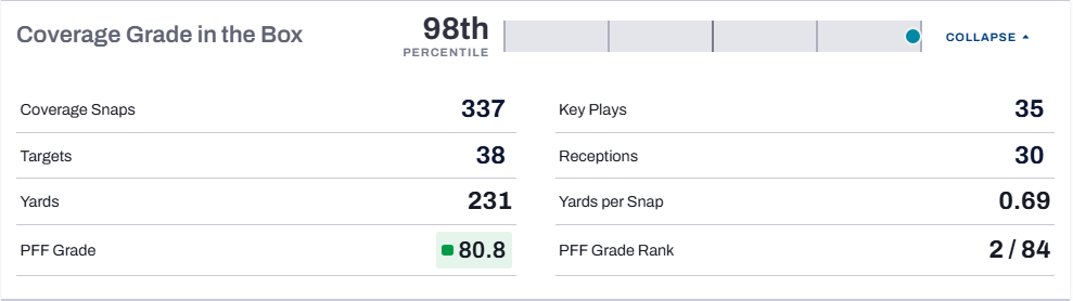 Bush revitalized his career in Cleveland in 2024 and took another step forward with an increased role in 2025. He responded by posting the highest PFF overall grade of his career (87.6). Bush’s calling card has been his consistency as a run defender, where he has posted an 86.0-plus PFF grade in each of the past two seasons. But the key to his climb into the top five comes from his improvements in coverage, where his 80.8 PFF coverage grade in the box ranked in the 98th percentile.
