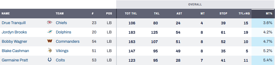 Missed Tackle Rate Leaders