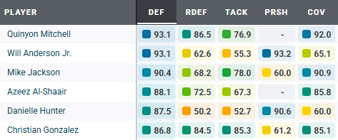 - Fred Warner tops the list: Although the sample is small due to his season-ending injury, Warner was on pace to lead the NFL in both PFF run-defense grade (91.3) and PFF coverage grade (91.5), standing as the only player to eclipse the 90.0 threshold in each.