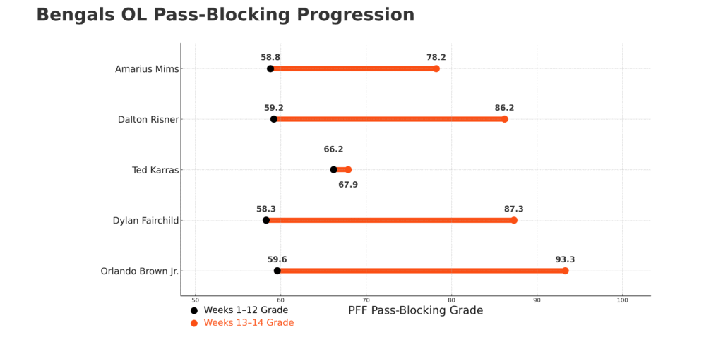 - No team has protected its quarterback better since Week 13: The Bengals own an elite 93.1 team PFF pass-blocking grade since Burrow returned from injury, leading the NFL by a wide margin.