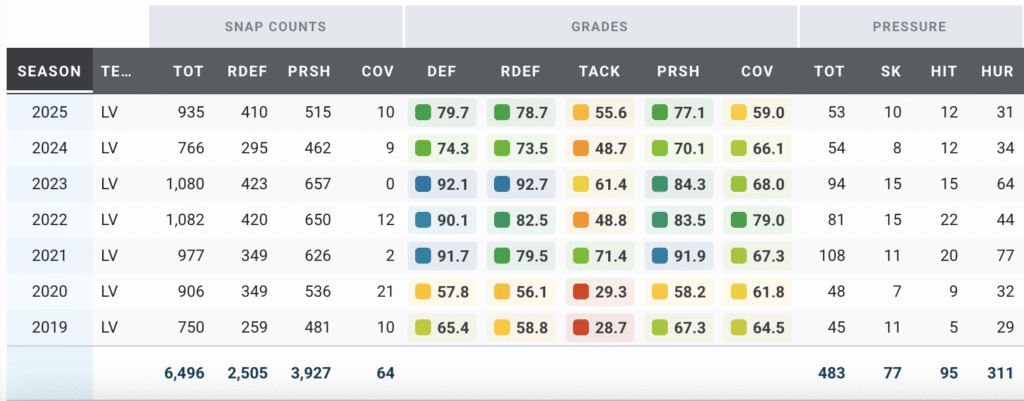 Over the past four seasons, Crosby has accounted for 33% of the Raiders’ total sacks and 27% of their pressures. While Crosby’s numbers have dipped slightly (by his standards) over the past two seasons, he still accumulated twice as many sacks as the next closest player on the defense, Tyree Wilson.