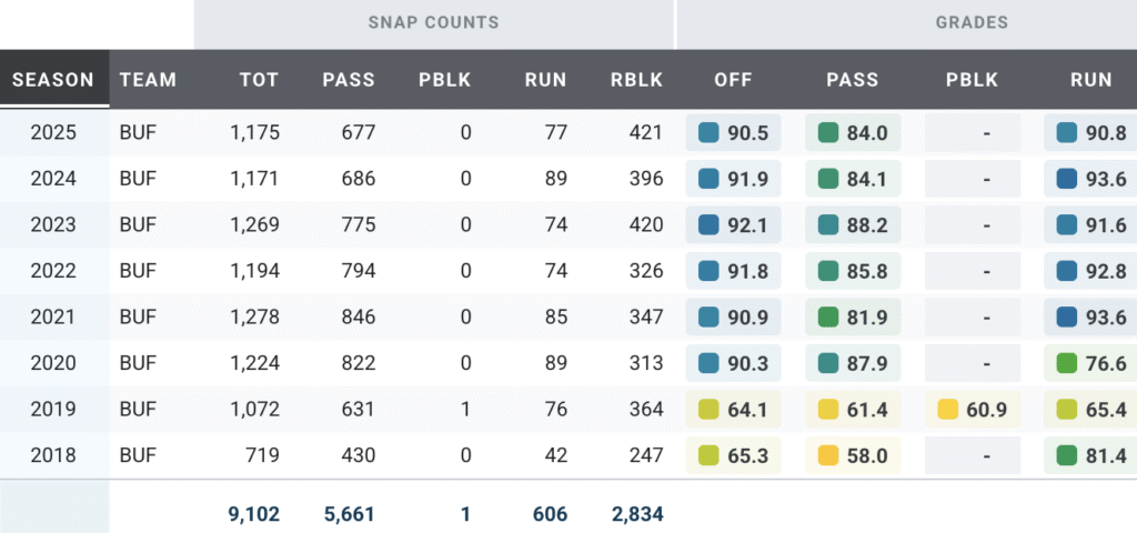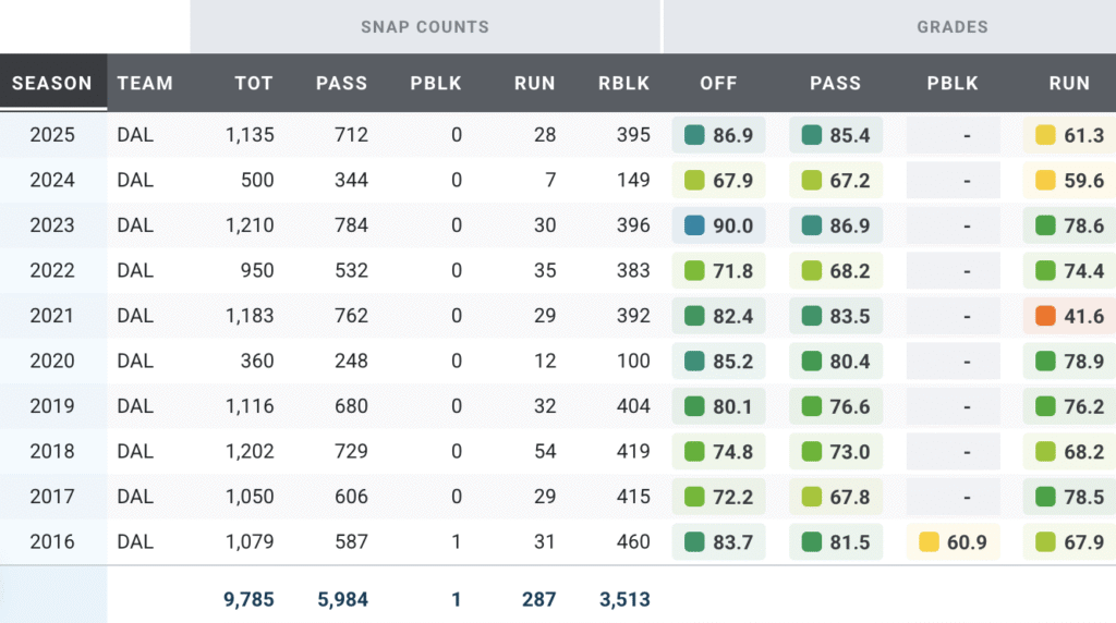 The dominant ground-game blocker was one of four offensive tackles to earn a PFF run-blocking grade above 90.0 in 2025. He wasn’t quite as effective as a pass blocker, but his 72.6 PFF pass-blocking grade was still good enough to rank 31st among 75 offensive tackles who played at least 400 snaps in 2025.