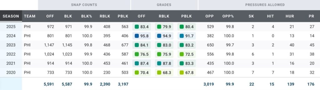 Mailata continued his dominance as one of the pound-for-pound best linemen in football. His 87.7 overall PFF grade was the sixth-best among qualified tackles, ranking sixth in both PFF pass- and run-blocking grades. The 2025 campaign marked the third straight year in which Mailata allowed three or fewer sacks with at least an 84.8 overall grade.