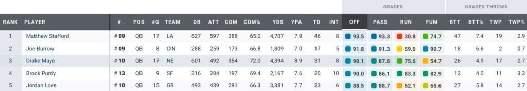 - Matthew Stafford slots in as the highest-ranked quarterback: His 91.9 PFF passing grade and 7.7% big-time throw rate paced the position. It was the first time in the 38-year-old's career that he earned a PFF overall grade above 90.0.