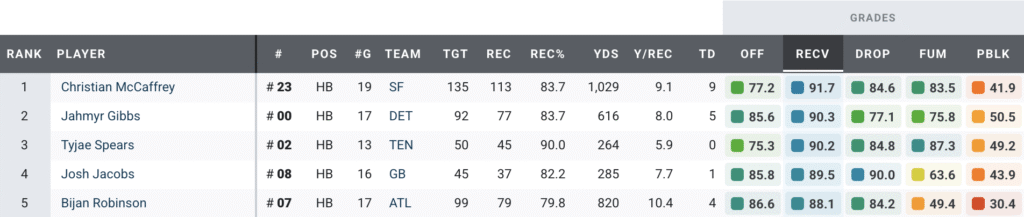 Gibbs’ 85.6 PFF overall grade in 2025 ranked sixth among running backs, and he logged PFF grades above 80.0 both as a runner and as a receiver. His 90.3 PFF receiving grade was a career high, with the 12th overall selection in the 2023 NFL Draft racking up 616 yards from 77 receptions.
