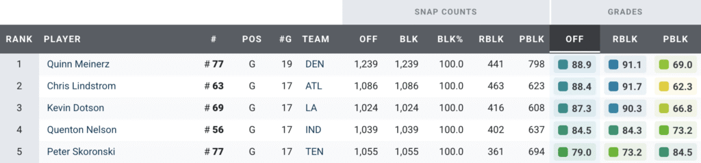The only guard to finish in the top 20 of this year’s PFF 101, Meinerz continued his trend of improving his PFF overall grade every season. His 88.9 PFF overall grade in 2025 led all guards, largely because of an elite 91.1 PFF run-blocking grade that trailed only the Falcons’ Chris Lindstrom.
