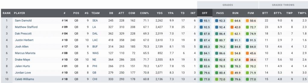 The second-year signal-caller earned an 81.1 overall PFF grade for his performance on Sunday, his second-best mark of the season. Over the past two weeks, his 90.7 overall PFF grade leads all quarterbacks.