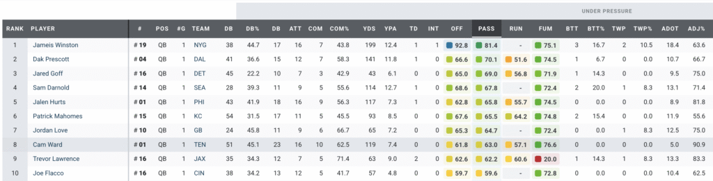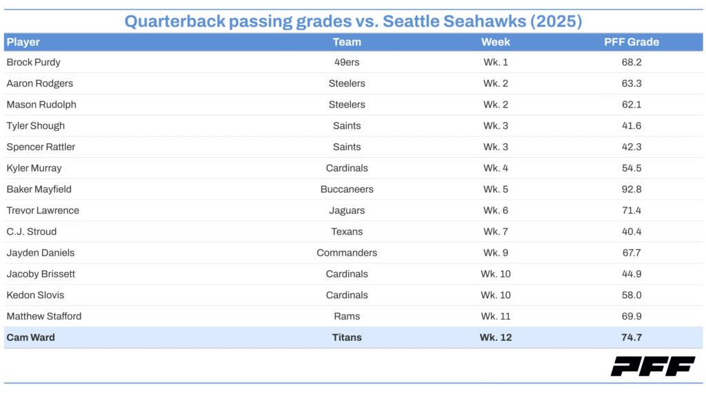 - A standout performance from Cam Ward: The rookie earned a career-high 78.7 PFF overall grade, offering a clear glimpse of his long-term potential. The Seattle Seahawks defense has been a problem for quarterbacks all season, yet Ward posted the second-highest PFF overall grade they’ve allowed in 2025.