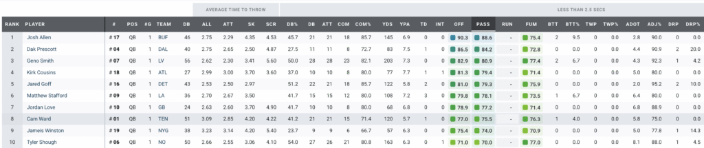 Ward’s processing against Seattle was also the quickest it has looked all year. He consistently knew where the ball needed to go, and when his receivers came open, he didn’t hesitate. He earned a 75.5 PFF passing grade on throws delivered in under 2.5 seconds, his best mark of the season.